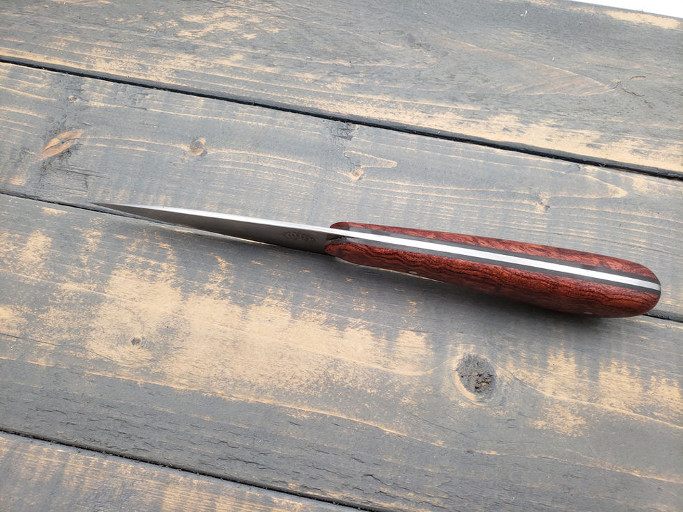 Forged from 15n20, this paring/kitchen utility knife is 8 1/4" (210 mm) overall with a 3 11/16" (96 mm) cutting edge, and 3/32" (2 mm) at the spine. It features a flat grind, and has a hand rubbed scotchbrite finish.